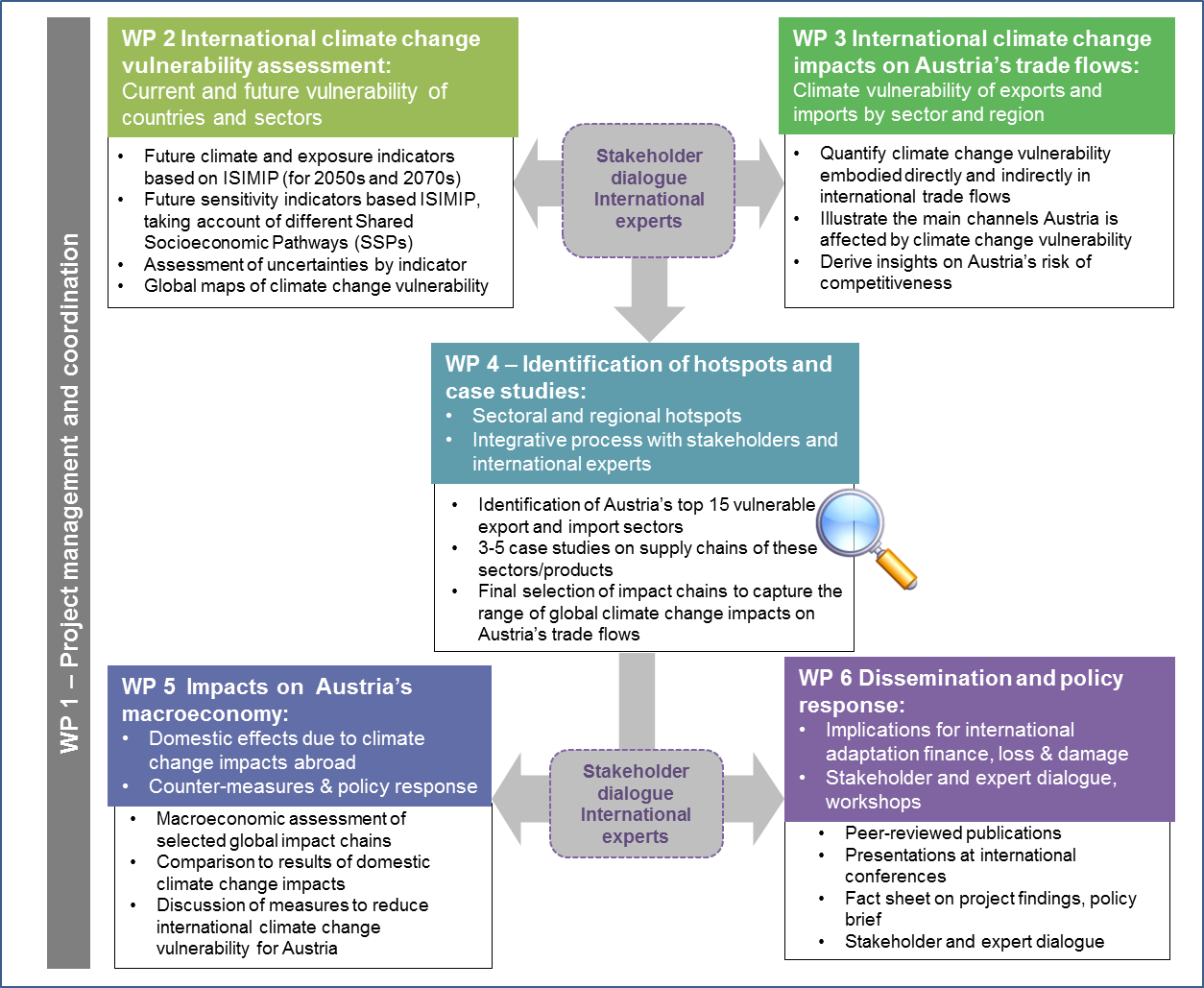 Figure 1 illustrates the methodological approach of the project. Based on international studies on the vulnerability of trading partners, we analyze the current and future impacts of climate change for Austria’s foreign trade (WP2). Different climate scenarios (RCP4.5, RCP 8.5) as well as different socioeconomic scenarios (SSP2, SSP3) are considered. On the basis of available climate impact models for agriculture, water availability, sea level rise, health and labor productivity, WP3 examines relevant impact chains with regard to their relevance for Austria’s import and export flows. In addition, case studies will illustrate individual impact channels using concrete examples (WP4). The relevant global impact chains are finally examined with regard to their repercussions on Austria’s economy (WP5). Finally, WP6 will discuss measures and instruments to reduce these trade induced risks of climate change.